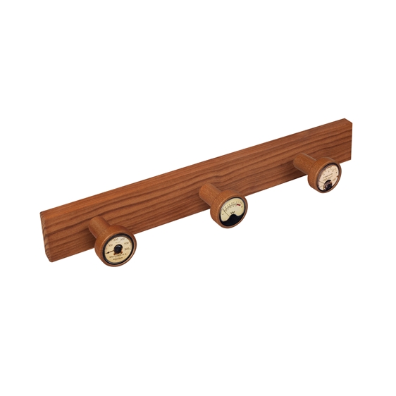 Wall hangers made of natural stained and aged wood with retro and vintage designs. This particular model is MOD 9090 wall hanger knobs painted wood old meters vintage retro