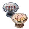 Pomos tiradores de mueble diseño vintage retro con motivo serigrafiado en chapa de metal sobre base de pomos en metal o madera. Una vez montados en el cajon quedan muy bonitos. Este modelo en concreto es el MOD 550D pomo tirador bronce con patina blanca a